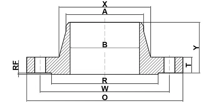 | Nominal Pipe Size | Outside Diameter (O) | Bolt Circle (W) | Raised Face Diameter (R) | Number of Holes | Diameter of Holes | Bore (B) | Point of Weld (A) | Hub Diameter (X) | Thickness (T) | Length Thru Hub (Y) | Approximate Weight (lbs) |
